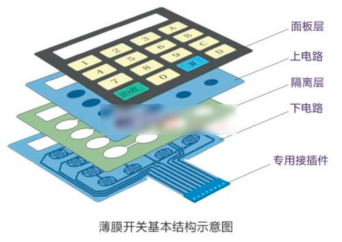薄膜開關(guān)是集按鍵功用、指示元件、儀器面板為一體的一個操作系統(tǒng)。是選用PC,PET,F(xiàn)PC及雙面膠等軟性資料,運用絲網(wǎng)印刷技術(shù)制造而成的 多平面組合密封的集圖形、按鍵、標記符號顯示、導(dǎo)電及薄膜開關(guān)功用于一體的塑膠電子制品。廣泛應(yīng)用于電子通訊、工業(yè)操控、醫(yī)療器械、汽車工業(yè)、儀器儀表、家用電器、兒童玩具、軍工設(shè)備等行業(yè)和領(lǐng)域。常見薄膜開關(guān)各部分組成原料: